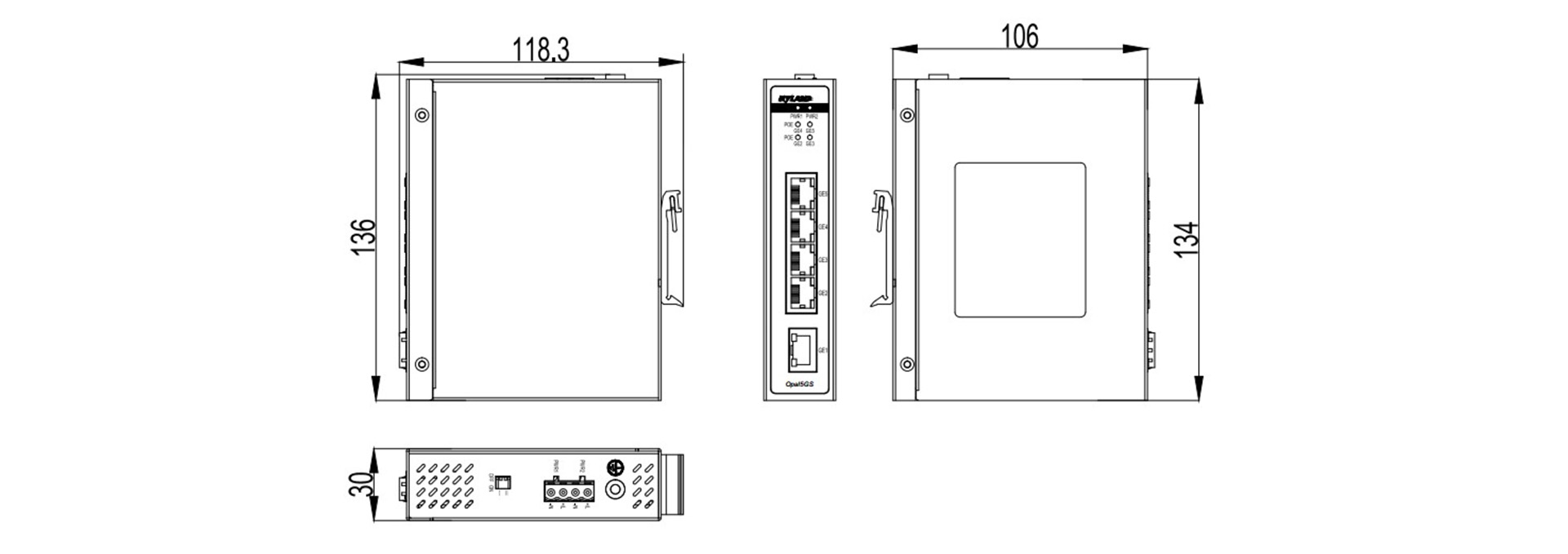 | Physical Characteristics | Housing Metal Cooling Natural convection, fanless Protection Class IP30 Dimension 30mm×136mm×106mm(W×H×D) Weight <0.5Kg Mounting DIN-Rail Mounting |