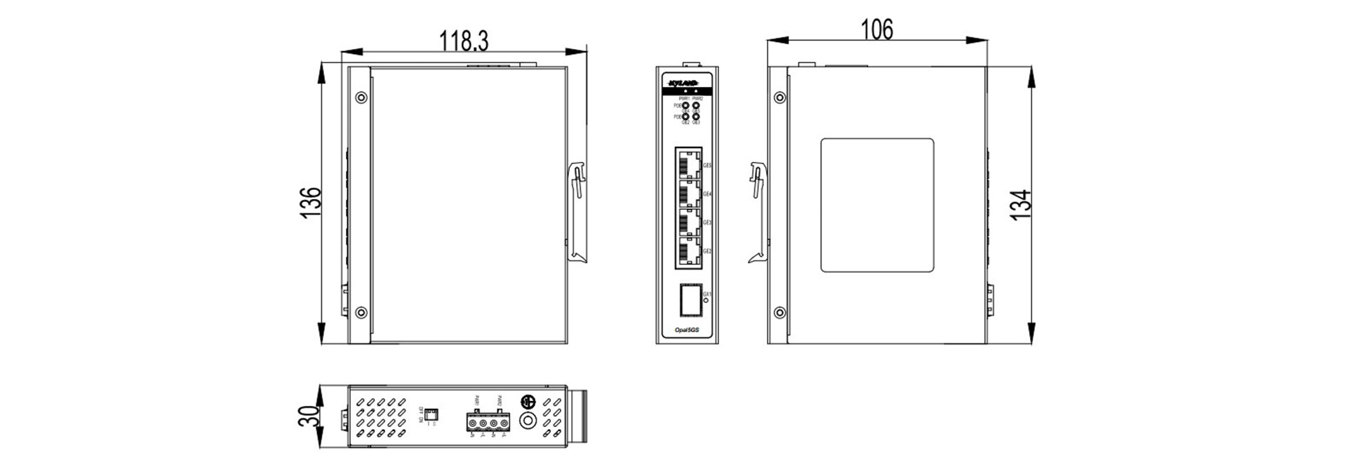 Opal5GS series are unmanaged 5-port PoE switches, providing 1 Gigabit SFP/Copper port and 4 10/100/1000Base-TX PoE ports compliant with IEEE802.3at/af. While transmitting data over the cable, each PoE port can output 30 watts to PoE terminals directly, eliminating the need for additional wiring.