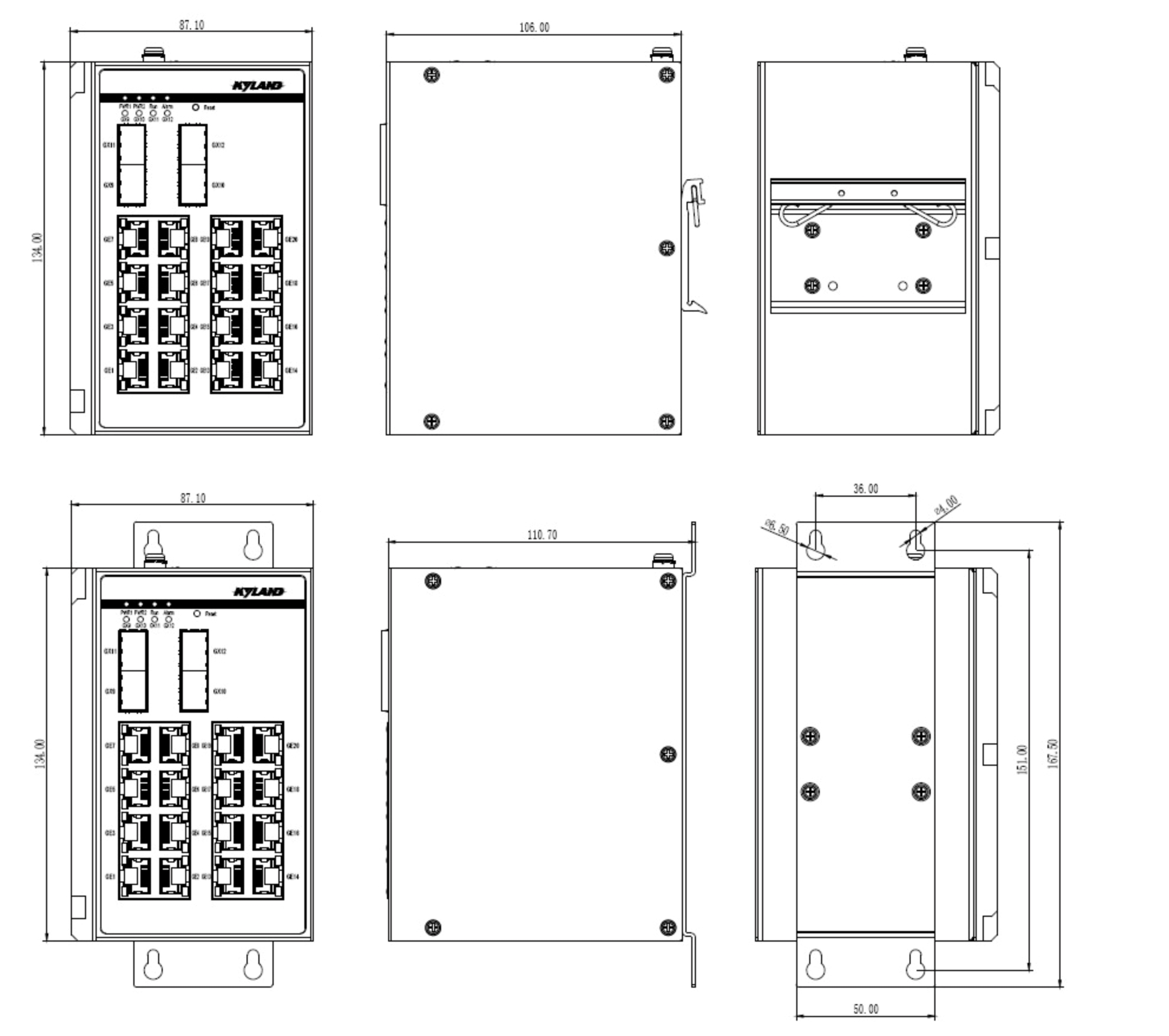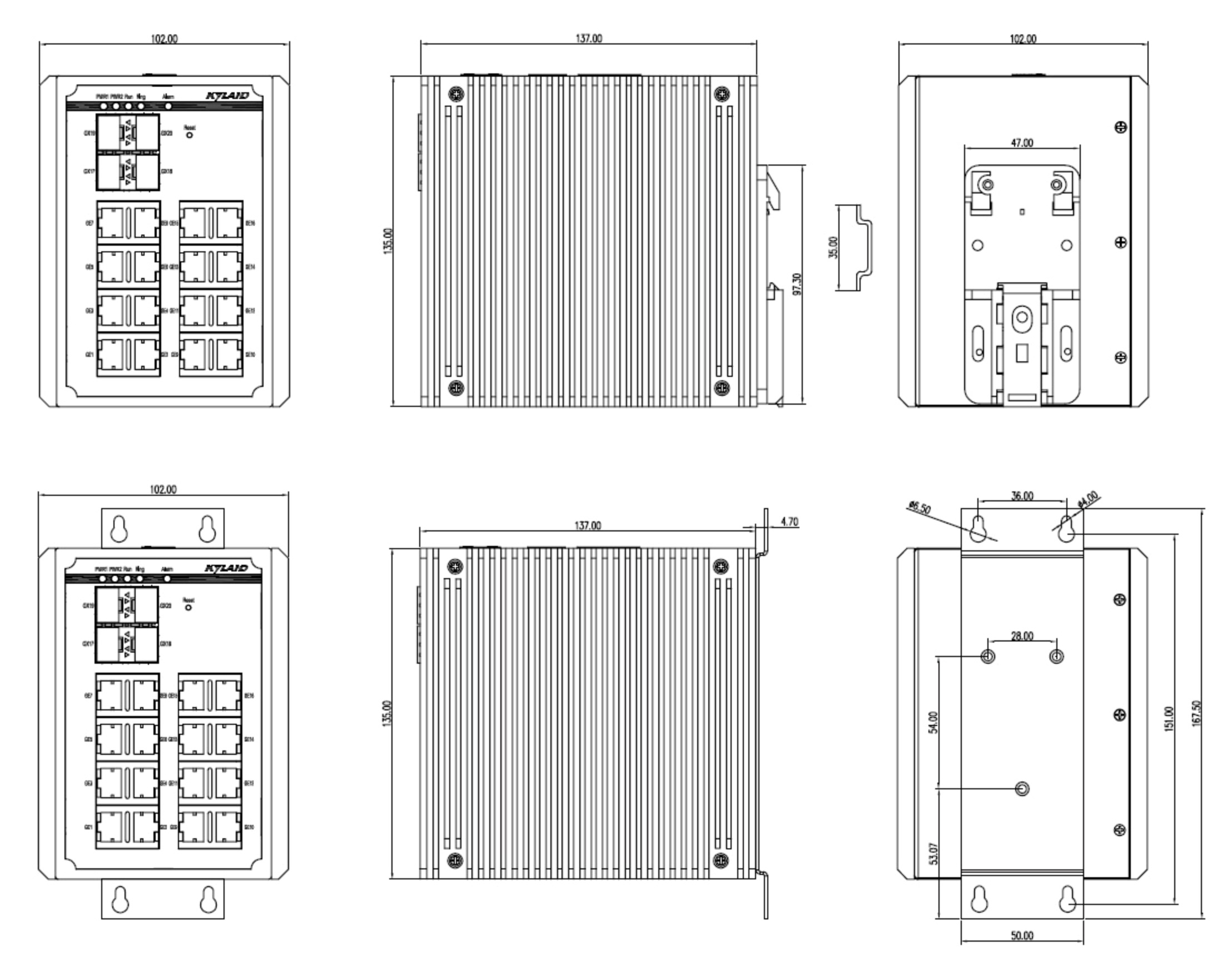 | Management and Maintenance | Supports Console, Telnet, WEB management methods Supports SNMPv1/v2c/v3, Kyvision centralized management Kytools IP manager management Supports software upgrade by FTP/TFTP Supports Power alarm, IP/MAC conflict alarm, Memory/CPU usage alarm, Port alarm, Ring alarm, Port traffic alarm, CRC error and packet lose alarm, SFP port RX power alarm and TX power alarm Supports DDM (SFP port) Supports loop detection Supports RMON Supports port mirroring Supports Syslog Supports LLDP Supports Link-check | |
