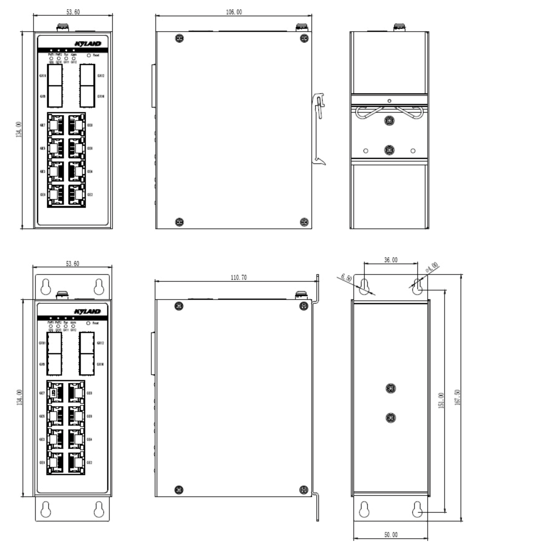 Ports | 88mm×135mm×137mm(W×H×D): 4GX8GE= 4×100Base-X, 1000Base-X, 10/100/1000Base-T(X) SFP ports; 102mm×135mm×137mm(W×H×D): 4GX16GE= 4×100Base-X, 1000Base-X, 10/100/1000Base-T(X) SFP ports; 16×10/100/1000Base-T(X) RJ45 ports |